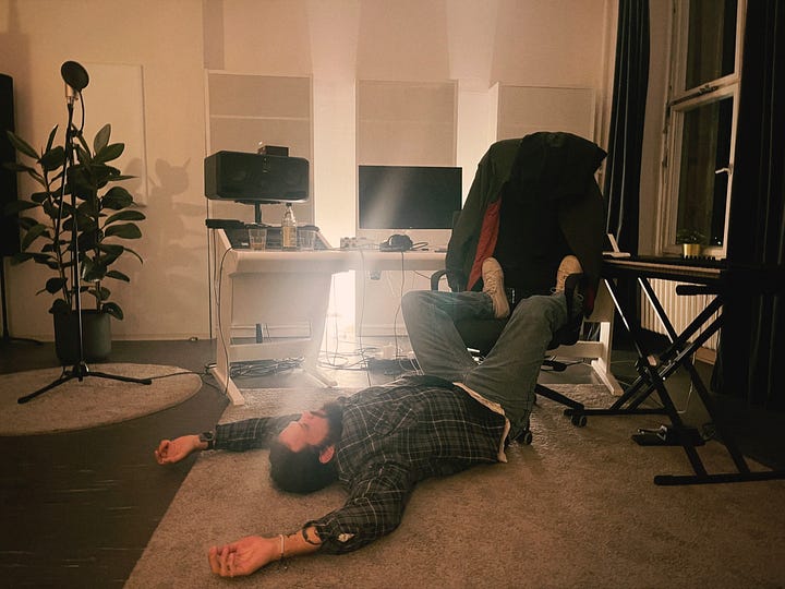Ich stehe dann morgens auf, skippe sogar meine morning routine mit Kaffee und Journal und bin zwischen 9 und 10 Uhr im Studio. Dann sind wir in unserer Blase. Wir hören, was wir am Tag vorher gemacht haben und schon verschlucken uns neue Ideen, die umgesetzt werden wollen und bis zum späten Abend unsere ganze Aufmerksamkeit bekommen. Zwischendurch haben wir stundenlang komponiert und recorded oder auch mal auf dem Boden gelegen und in die Deckenlampen gestarrt. Deep talks geführt und viel Quatsch geredet. Die Snackvorräte einer Großfamilie in Warp-Geschwindigkeit in uns verschwinden lassen und mindestens einmal am Tag habe ich es komplett verloren und mich minutenlang vor Lachen nicht mehr einbekommen. Es ist wild. Es ist intensiv und irgendwie nicht von dieser Welt. Ich treffe die albernste, aber auch wahrhaftigste Version meines Selbst. Ich liebe alles daran und dennoch brauche ich danach mal einen Tag Pause.