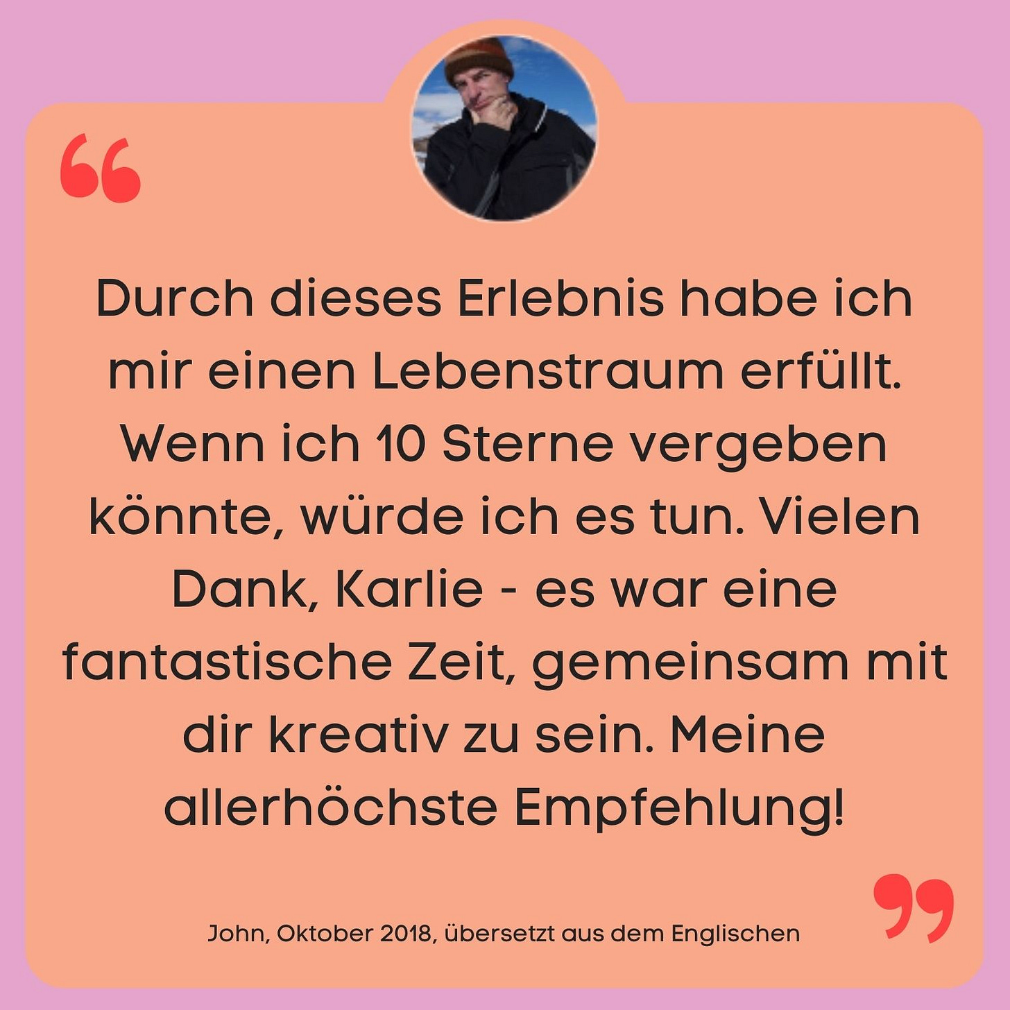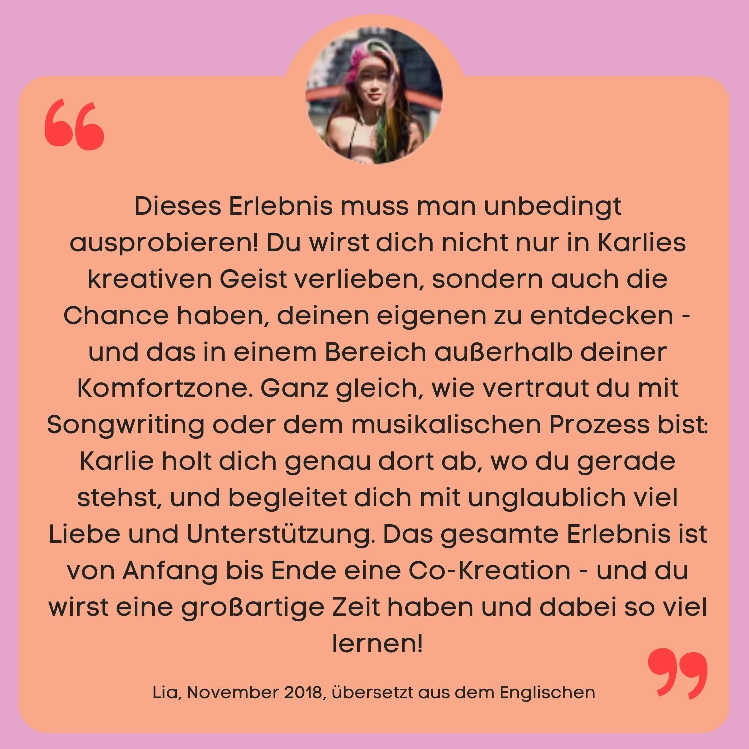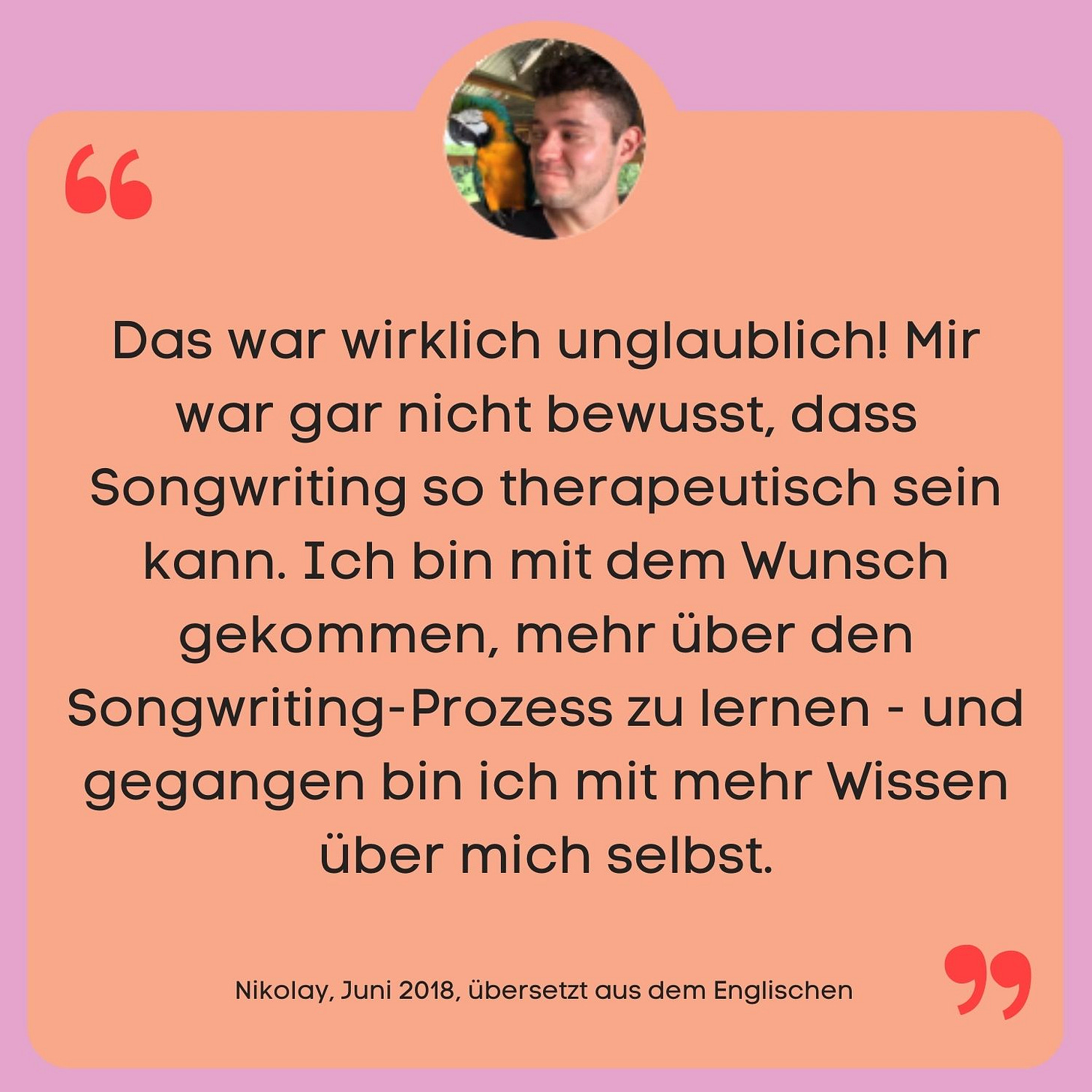 Ich sage es, wie es ist. In diesen Sessions wirst du erleben, wie viel Kreativität in dir steckt. Meiner Erfahrung nach geht es aber meistens noch um viel mehr, als nur darum, einen Song zu schreiben. Über das Freewriting am Anfang kommst du in den Kontakt mit dir selbst. Daraus sind immer wieder sehr persönliche Songs entstanden, die für die Teilnehmenden eine tiefe Bedeutung hatten. Ich bin heute noch dankbar für die Offenheit, die in diesem sicheren Raum entstehen darf.